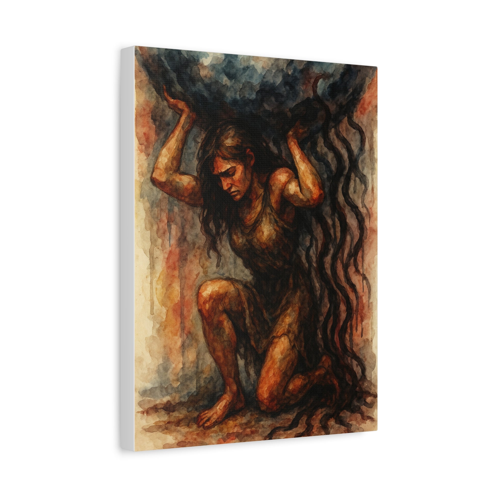 Experience the emotional depth and inner power of "Atlas Within Her"; with this watercolor canvas print, perfect for those who resonate with themes of endurance, feminine strength, and emotional resilience. Ideal for living rooms, creative studios, or motivational spaces, this artwork captures the raw strength of a woman facing invisible forces yet unbroken.